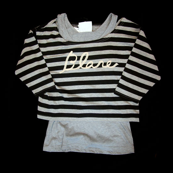 This women’s T-shirt comes with a scoop neck and long sleeves. The stylish tee is designed with black and gray stripes all over and elegant lettering on the front. This attractive top goes well with a plain tank top underneath.