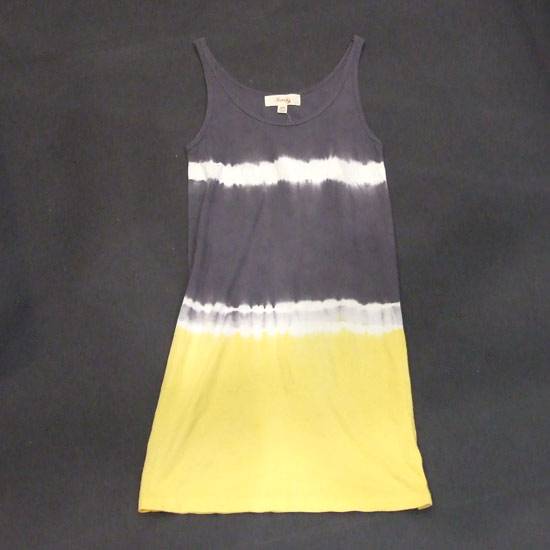 • This sleeveless one piece dress is gray, white and yellow in color.