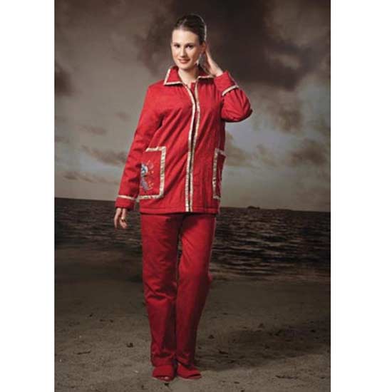 This set of pajamas features a simple design. Stunning golden trims accentuate the sharp red design. Made of fine-quality material, the feminine pajamas are very comfortable to wear. Enhance your comfort of sleeping with the soft-touch pajamas.
