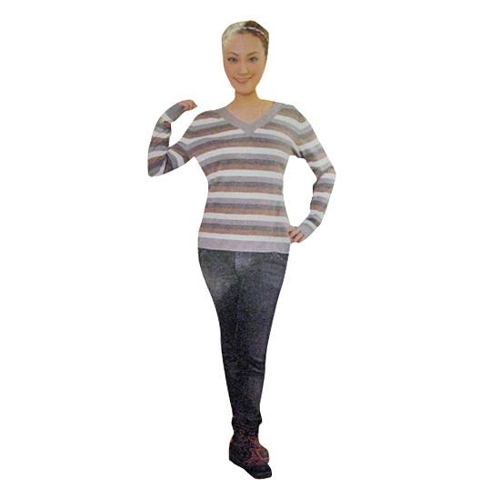 The women's pullover is made of 80% viscose, 18% polyamide and 2% spandex to ensure comfort and flexibility. Moreover, it is decorated with brown, grey and white horizontal stripes. Furthermore, it is warm, and suitable for autumn and winter.