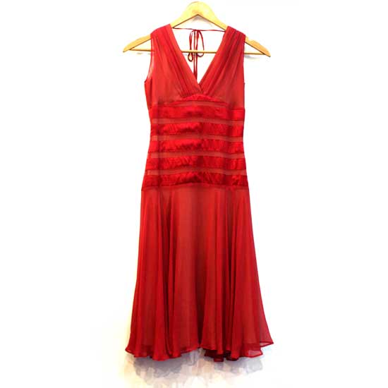 This silk dress features a deep V-neck and sleeveless design. The middle part of this dress features several horizontal stripes to add a special touch to it. Made of fine-quality silk, this knee-length dress is very comfortable to wear. Complete your closet with this elegantly designed dress.
