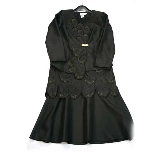 This displayed set of women’s suit comes in classy black. The suit includes a jacket and a skirt, both adorned with fancy embroidered patterns. The ever-popular black ensures that the suit stays in style for years.