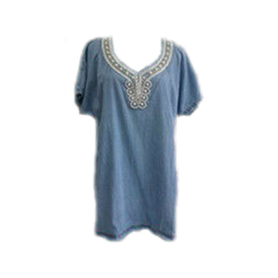 Showcased here is a women’s T-shirt with a scoop neck and short sleeves. The blue T-shirt features alluring embroidery along the neckline with ethnic flair. Complete your casual yet stylish look with this ingenious ladies’ T-shirt.