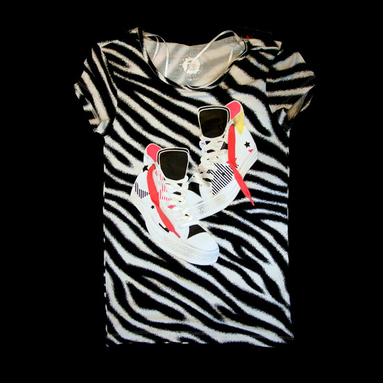This women’s T-shirt features an enchanting zebra print, evoking a sense of vogue. The lovely print of sneakers lends extra style to the appearance. Made of 95% viscose and 5% elastane, this stylish tee promises utmost wearing comfort.