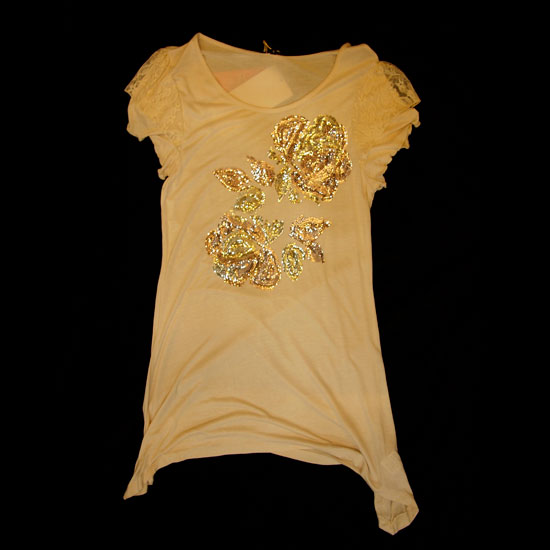 This beige women’s T-shirt comes with a scoop neck and cap sleeves with lace embellishments. The front is designed with glittering floral motifs, stealing the spotlight immediately. This lovely tee is finished with an asymmetrical hem for extra vogue.