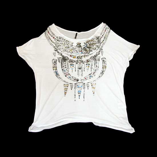 This bright white women’s T-shirt comes with a round collar and batwing sleeves. The lovely necklace print spices up the design with a touch of uniqueness. Made of 100% viscose, this tee promises optimum wearing comfort.