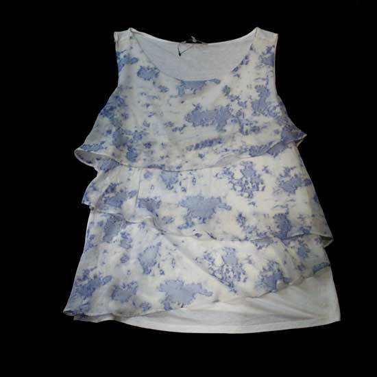 This white women’s tank top is characterized by its flared tiers with blue floral motifs. The A-line cut helps convey a breezy and girlish vein. Made of viscose and lycra, this beautiful tank top bestows gratifying wearing comfort.
