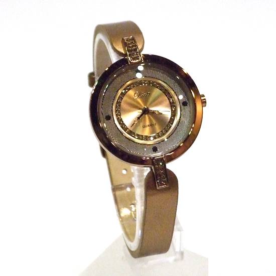 The featuring fashion accessory is a quartz analogue watch for ladies and women. The watch straps and the frame are gold in colour, decorated with glittering stones on the dial to show a classical style.