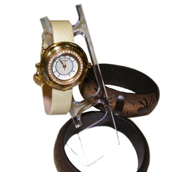 This women's watch is designed in an elegant style. The dial is in a golden round shape with a circle of cubic zirconias to add more sparks. A glittering stone embellishes the watch and enhances the elegance of the wearer.