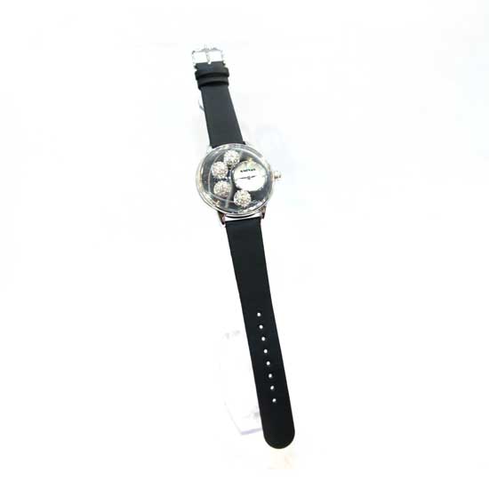 This photographed watch gives a stunning design with a watch-in-watch concept. The four petite balls inside the dial are paved with sparkling stones. The neat and clean small dial presents time with numberless markings.