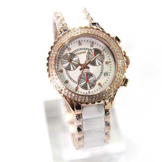 This women's wrist watch boasts a smooth ceramic and stainless steel construction. The gold watch case and white dial are finely encrusted with numerous white precious stones. Add a touch of subtle sophistication to your wardrobe with this timeless luxury watch.