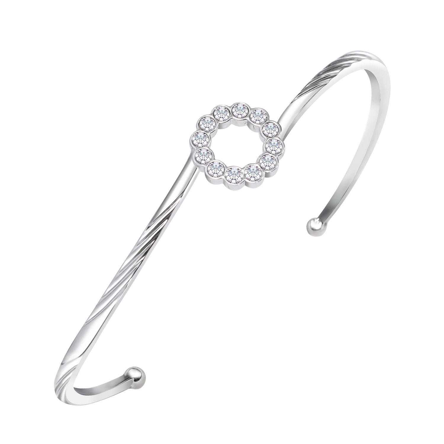 Graceful and utterly feminine, this bangle is the finishing touch you need for your cocktail attire. Featuring a slightly wavy silhouette and spotlighted with a ring of sparkling stones at the very center, this piece is timeless and elegant. To finish off the polished bangle, tiny strokes are etched along the band for a refined and delicate finish. Match this exquisite bangle to a light-colored cocktail dress for a classy and feminine look.