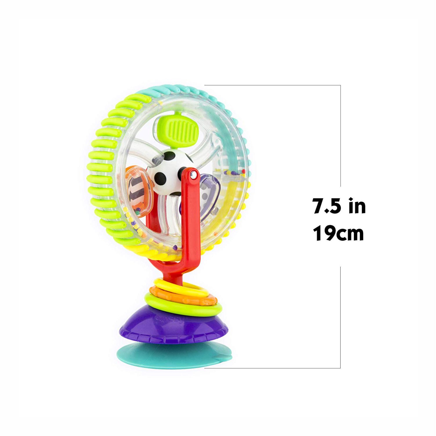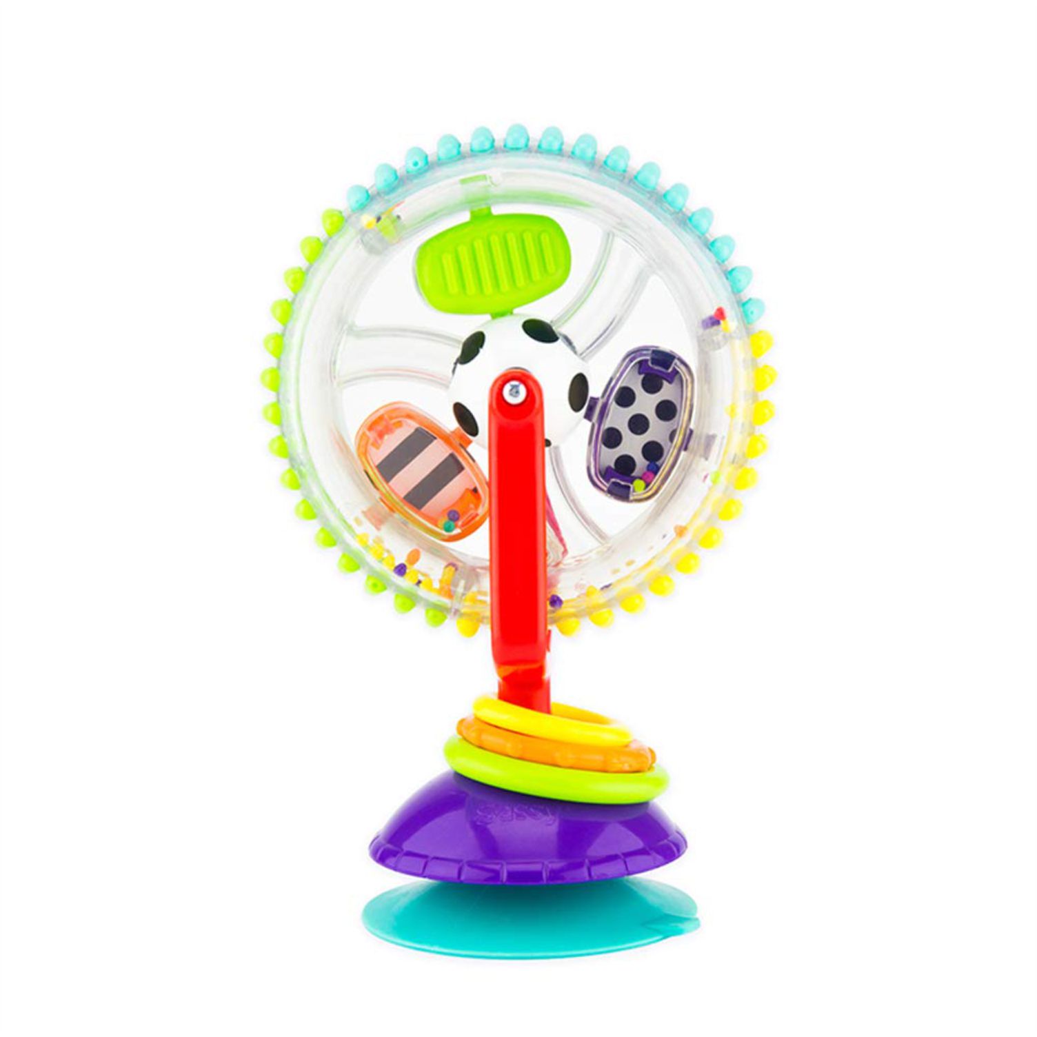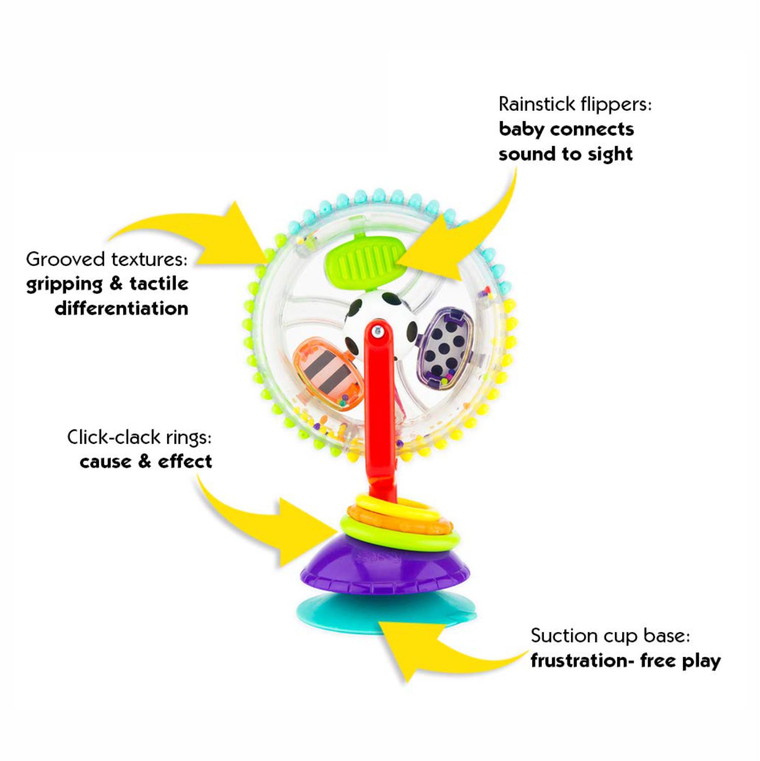 • Spinning wheel encourages baby to reach, tug, and bat, developing hand-eye coordination.