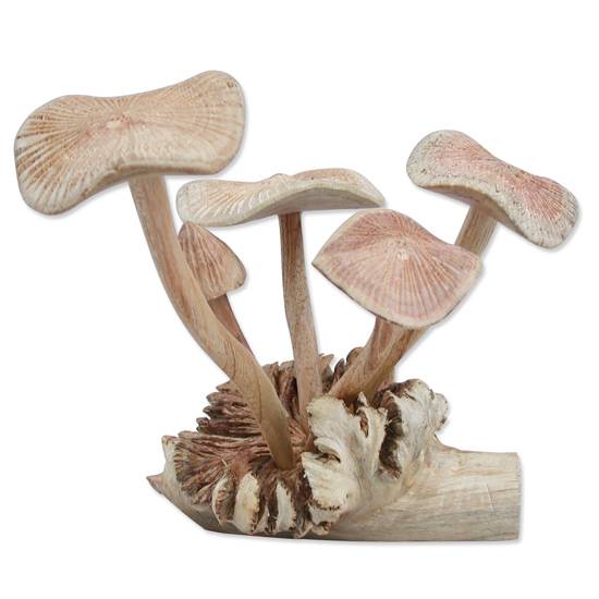 The featured wood carving has a realistic appearance of wild mushrooms. Carved out of one single piece of wood, shows excellent craftmanship. Ideal decoration to bring a sense of natural feeling to the household.