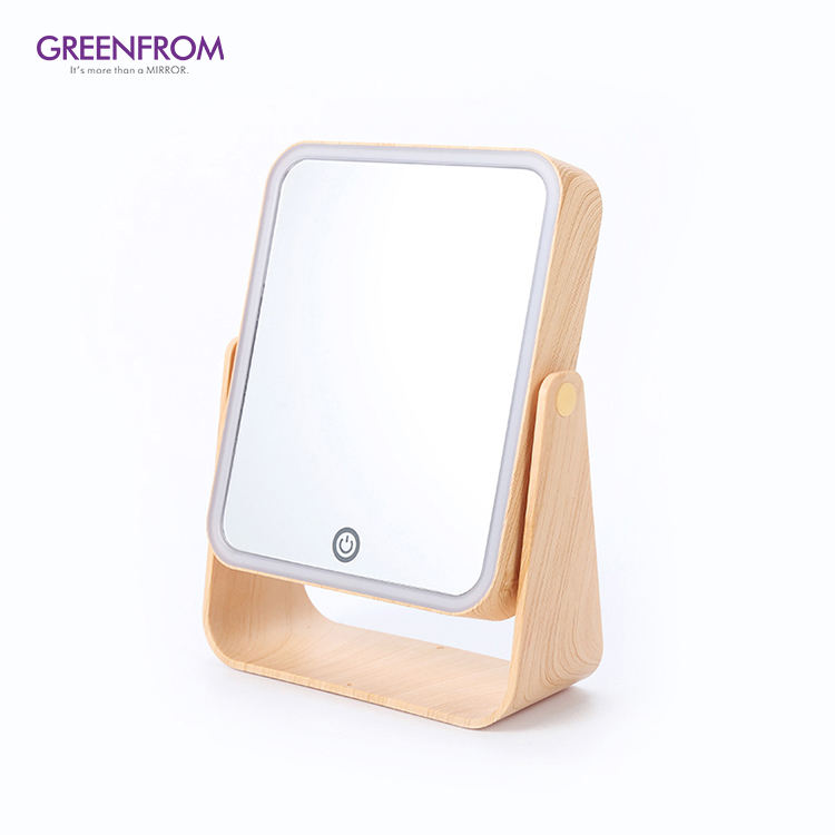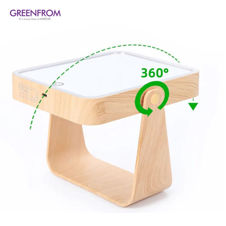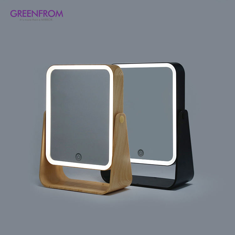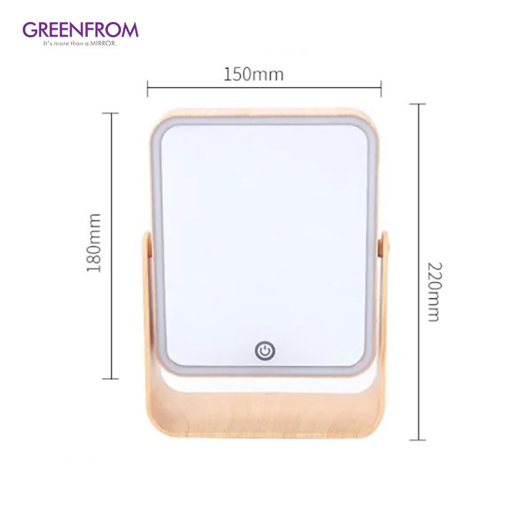Wood Grain Led Double Side Desk Mirror 360 Degree Swivel Table Makeup Mirror