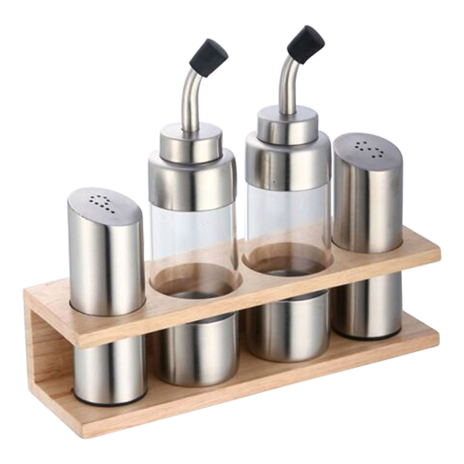 We have a bucolic kind of cruet stand for you. Shown here is a simple cruet set with a wooden rack for keeping dining tables neat and tidy. The rectangular stand goes together with salt and pepper shaker, as well as oil and vinegar bottles. Two shakers are cut with a slanting top, while the liquid holders come in transparent middle panels. The whole set is a fantastic addition to tables in restaurants or homes.