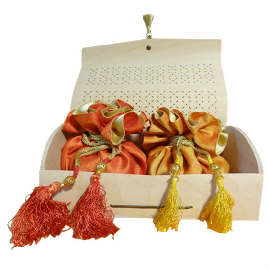 Perfect for those who like to organize in style, this patterned wood veneer box is an excellent box to store your personal items. The box made of natural wood is meticulously engraved with geometric patterns on the lid. 2 engaging satin drawstring bags with tassels are enclosed with the box for added allure. Get this wood veneer box and drawstring bags now to clear the clutter on your desk.