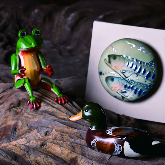 With green body and orange belly, Orange Belly Tree Frog also writes a beautiful page for Taiwan! Besides, we also choose Mallard Wood Sculpture, which has been a fad in 1981 as well as Formosan Landlocked Salmon Ceramic Painting and Orange Belly Tree Frog Wood Sculpture, we want to show our respects to the curve art, china art and creatures!