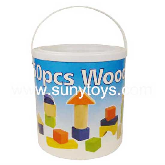 Displayed is a wooden block that comes in a bucket. With sufficient pieces in various styles, you child can build objects freely. This toy block is made of colorfully painted wood for a fun look.
