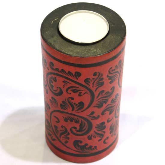This is a candle holder with a sturdy mango wood construction. It features a cylinder shape highlighted by geometric engraved patterns. Enhance your table setting in a pretty way with this wooden candle holder.