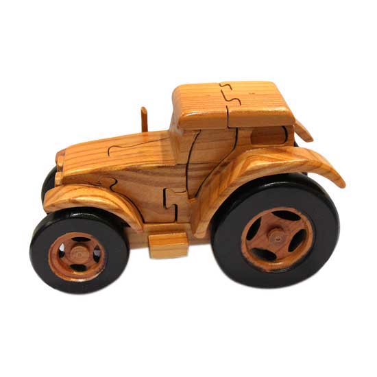 Displayed is a wooden car that comes in the shape of a tracker car with oversized rear wheels. Made of high quality wood, this decorative car features gentle wooden patterns on the surface. This nice wooden car is an ideal choice for decorating your home or office.