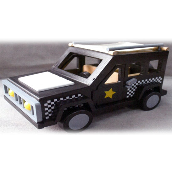 This is a cool toy car in black with charming patterns. It has a robust wooden structure with exquisite details. This well-made toy car is a great choice as a gift for car model lovers.