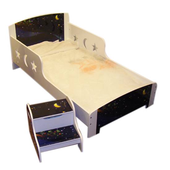 This is a wooden children bed with a mini staircase. The head board of the bed is printed with cartoon figures whereas patterns of moon and stars are on the sides of the bed. The bed boards on two sides protect the asleep kids from falling off from the bed. The upper step two-step mini staircase is a mini container for clothes or toys.