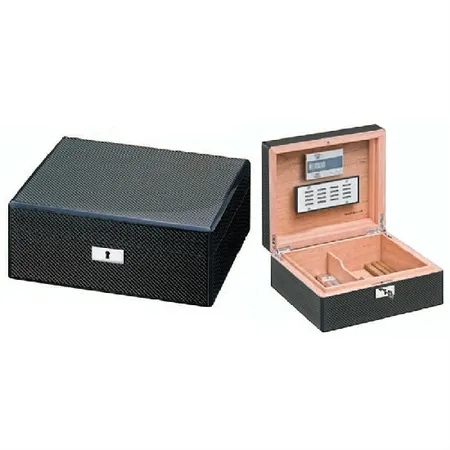 This luxurious wooden humidor is coated with genuine carbon fibre, piano finish.  Fitted with digital hygrometer/thermometer and humidifer.