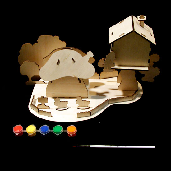 Display is a wooden craft set with a paint brush and colors. The garden house design adds a touch of style. This wooden craft painting set makes a wonderful addition for art and craft lessons.
