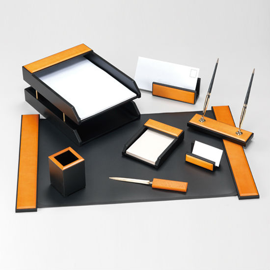 Featured here is an 8-piece desk set in a sophisticated wooden construction. The set includes a desk pad, name card holder, letter opener, pen stand, desk clock, pencil cup, memo holder and double letter tray. Add class to your office desk with this wooden desk set.