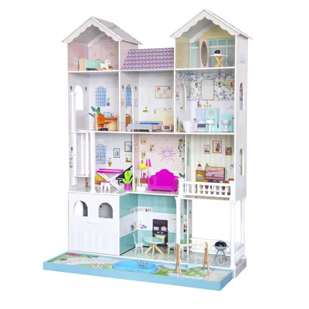 Constructed with sturdy and durable wood, this play dollhouse provides a safe and imaginative play environment for children. The wooden dollhouse set features four spacious stories, complete with intricate architectural details, including charming windows and delicate rails. Each floor offers ample room for children to arrange furniture and create unique living spaces, encouraging fine motor skills and spatial awareness. The open-front design ensures easy access for little hands, making it simple for children to interact with every room.