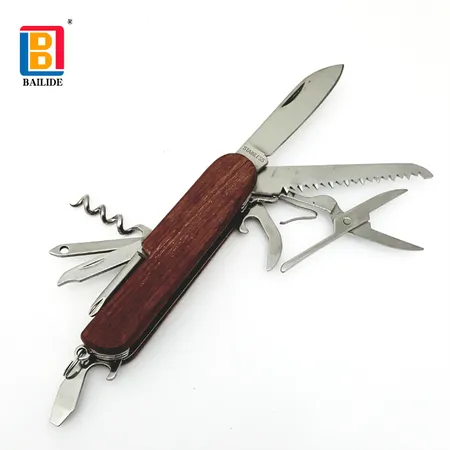 • Wooden handle with knife, scissors, saw, can opener, bottle opener, wine corkscrew nail file etc.