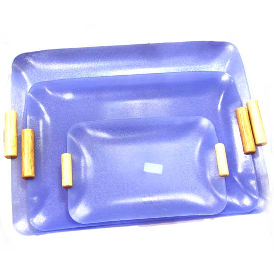 Featured is a set of serving trays in a vivid color. The decorative wooden handles add a decorative touch. These multifunctional trays are a versatile addition to households.