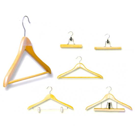 This is a series of wooden hangers. The hangers are in a mustard wood colour with gloss finish. The series include hangers in should shape, straight and skirt hanger type.