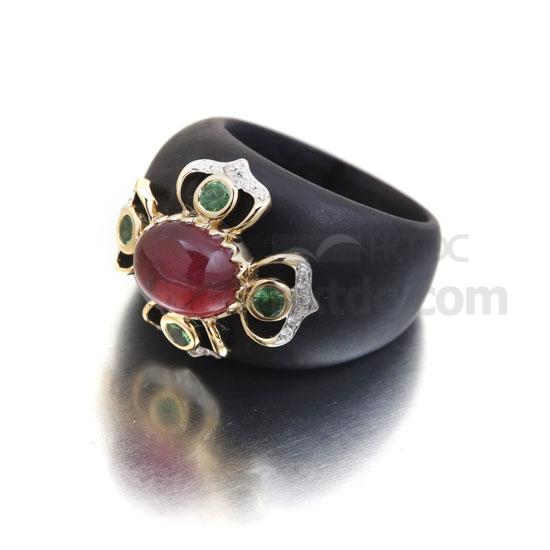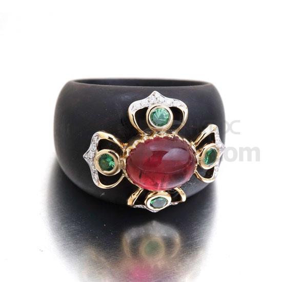 This ruby ring comes with a unique and stylish appearance. The ruby and tourmaline gemstones are fitted on a dark wooden hoop. The well-designed ring goes well with your fashionable outfits.