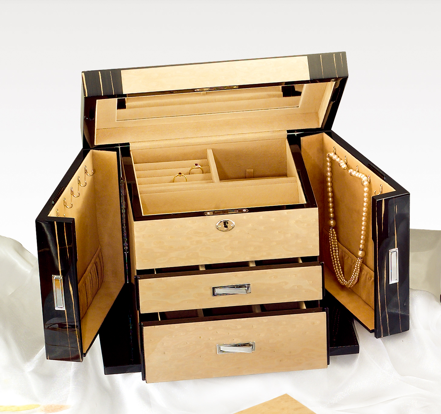 In-house designed Wooden jewelery chest of multi-purpose drawers and side closets. Laminated with veneers. Size: 340Wx240Dx255H(mm). The whole chest can be securely locked with the key lock provided. Buyers' own designs and specifications are welcome.