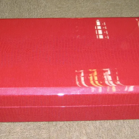 • Wooden jewellery box with stylish bevel lid. Red lizard pattern finish,