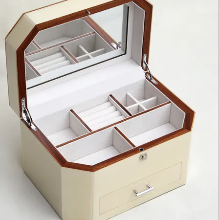 • Wooden jewellery box with drawer. In white stingray pattern finish with natural colour wood strips around, coated in a luxurious piano finish.