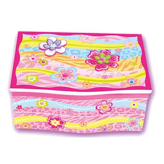 This magical jewelry box touts sophisticated wooden construction accented with wavy and stylish floral patterns. It will light up automatically when the lid is opened. Give your little girl a cheerful smile with this fancy jewelry box.