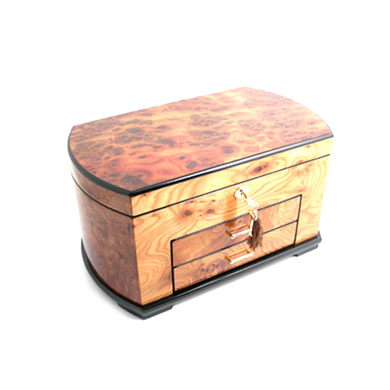 This wooden jewelry box features a glossy varnish. It is built with two drawers for organizing your vast jewelry collection. This sturdy box can be locked with a key for added security.