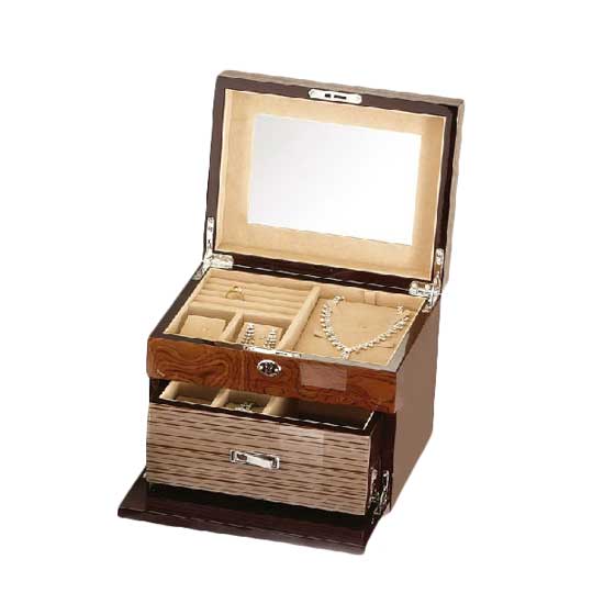 This is a jewelry case designed with two tiers. Each tier is crafted with individual compartments for keeping assorted jewelry in order. The jewelry box is laminated with veneer and features a highly glossy finish.