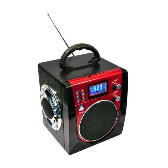The displayed mini speaker comes with a telescopic antenna for better signal reception and transmission. The garnet red panel matches the classy black housing nicely. Featuring a portable design, it is easy to carry around.