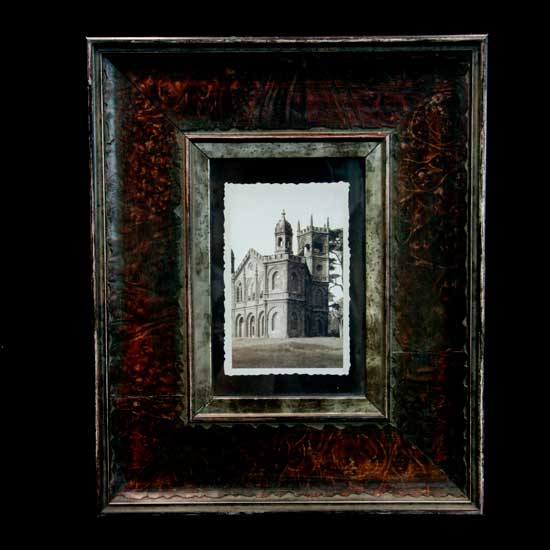 The photo frame here flaunts a vintage-look design. The frame is molded from wood, featuring tiered trimming and a fine inner frame. The dark tone of colors and patterns of the frame exudes a mysterious style.