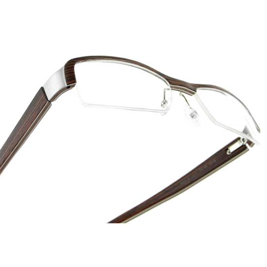 Displayed is a stylish optical frame that is made of wooden material. This excellent optical frame boasts an innovative aluminum reinforced construction. This semi-rimless optical frame is an ideal component for a pair of stylish glasses.