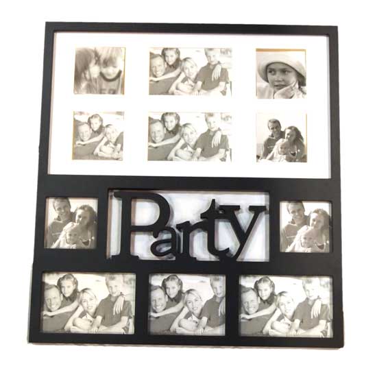 This rectangular black photo frame features several slots of different sizes. The cut-out word “Party” spices up the entire appearance with a touch of uniqueness. Fit your precious pictures into this beautiful wooden photo frame to freeze the best moments.