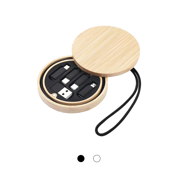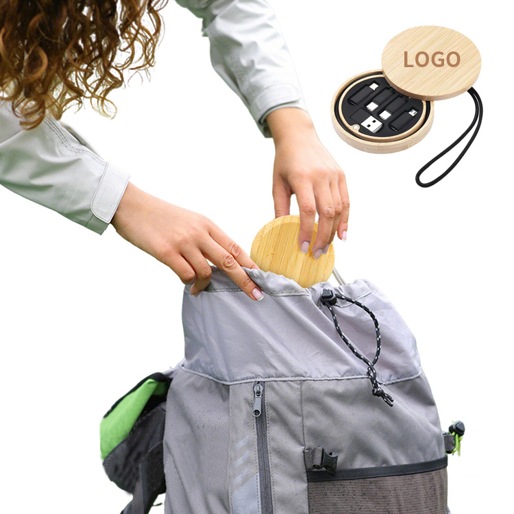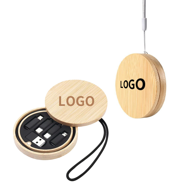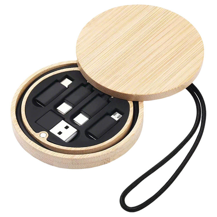 Eco-friendly Wooden Data Cable Box Multi Function Micro USB Type C 4 in 1 Data Cable Organizer with Lanyard