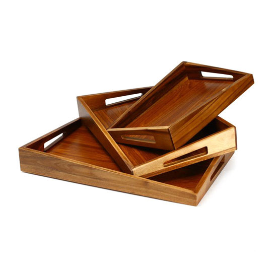 These wooden trays feature a rectangular-shaped design with irregular edges for a special touch. The wooden trays are made of quality acacia wood and are easy to clean. They are best used for serving coffees or gourmet food.