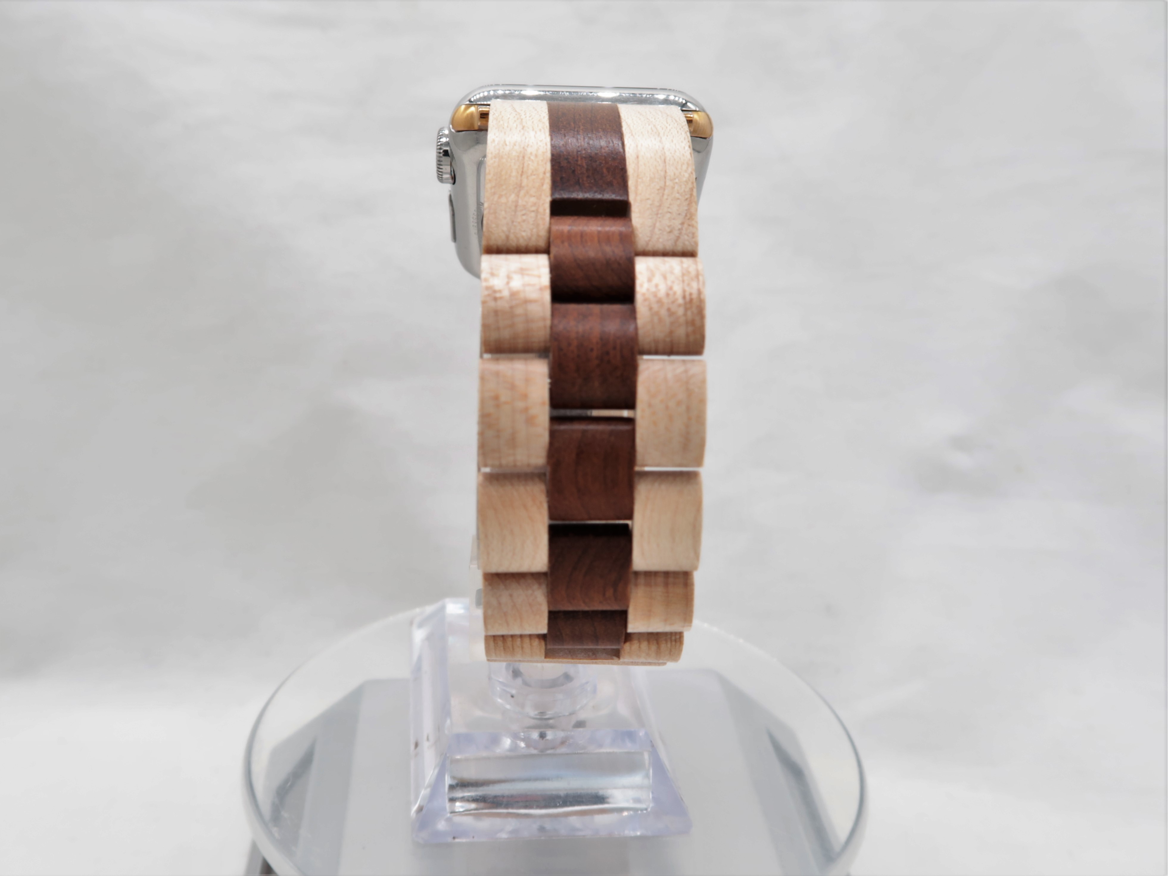 Made from sustainably sourced natural wood, each band features a unique dual-tone design with alternating light and dark wooden links, highlighting the beauty of organic textures. The lightweight build ensures day-long comfort, while the stainless steel clasp provides a secure fit.