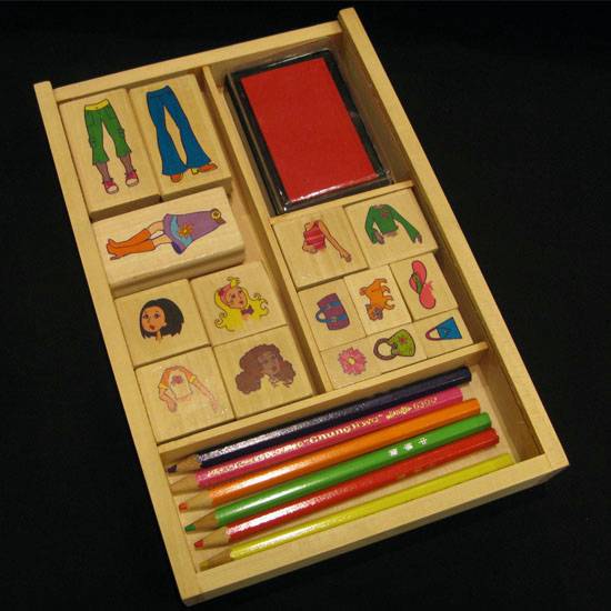 The wooden stamp set is designed for kids. It comes with a stamp pad, several stamps and a compartment for placing art supplies such as color pencils. This stamp set is an ideal gift and stationery item.