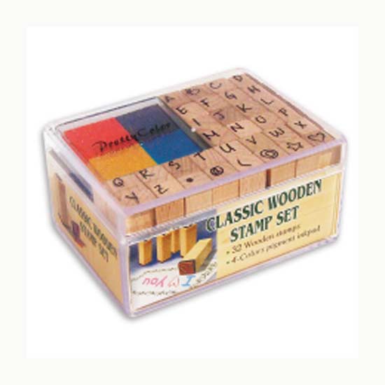 The wooden stamps set comes with wooden stamps featuring English alphabets and symbols like stars and hearts. The stamps feature square pillars and rubber stamps pads. A four-color ink pad is included.